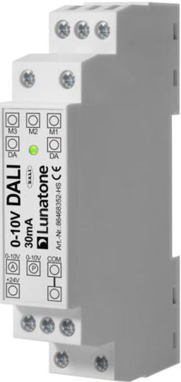 DALI konverteringsmodul som konverterer 0-10V signaler om til DALI broadcast kommandoer. Konverteringsmodulet er beregnet for DIN-skinne og fylder kun et modul.