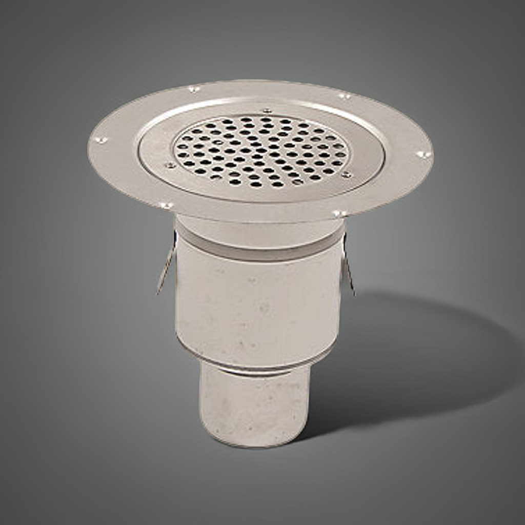 Rustfrit Blücher Circle gulvafløb med lodret Ø75 mm afløb.Det runde afløb er egnet til indbygning i tunge eller lette gulve med vinylbeklædning, fx i badeværelse eller bryggers.