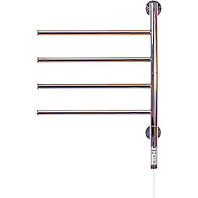Tinto håndklædetørrer, 625x445mm (HxB), 4 svingbare arme, poleret rustfrit stål, max 30watt.Elektrisk håndklædevarmer med fire svingbare stænger samt timer-regulering med mulighed for trinvis justering af varmen. Armene svinger parvist.Leveres færdigmonteret med synligt kabel (1,5m) og stikprop. Må monteres af enhver voksen, når der forefindes eksisterende, lovligt etableret stik.230V - 50Hz - isolationsklasse 1, IPX4.Afhængigt af installationsforholdene, må en autoriseret installatør montere med skjult el-tilslutning.