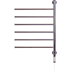 Tinto håndklædetørrer, 825x545mm (HxB), 6 svingbare arme, poleret rustfrit stål, max 39watt.Elektrisk håndklædevarmer med fire svingbare stænger samt timer-regulering med mulighed for trinvis justering af varmen. Armene svinger parvist.Leveres færdigmonteret med synligt kabel (1,5m) og stikprop. Må monteres af enhver voksen, når der forefindes eksisterende, lovligt etableret stik.230V - 50Hz - isolationsklasse 1, IPX4.Afhængigt af installationsforholdene, må en autoriseret installatør montere med skjult el-tilslutning.
