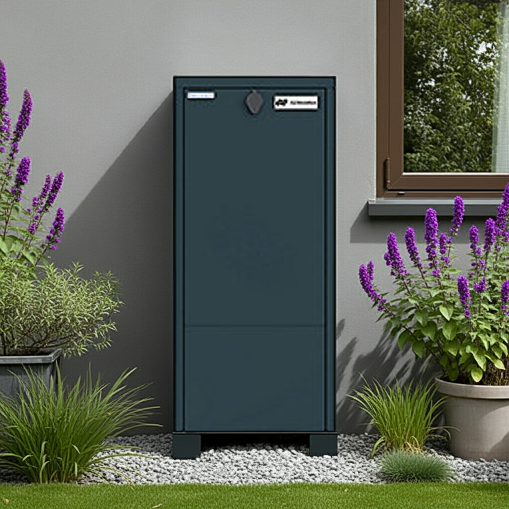 Materiale: Aluzink med højeste zinklegering.Aluzink har, udover en lang levetid, en særlig god vedhæftning for maling.Materialet kan efterbearbejdes uden at skabet ruster. Maling: Skabene er lakeret i en special udendørsmaling med UV-beskyttelse og særlig modstandsdygtig overfor slag. Aflåsning: Trekantslås med låsekappe i plast (kan plomberes).Låsen kan skiftes til f.eks RUKO cylinder. Isolering: 25mm specialskum med varmeafledningsevne på 0,036 W/m*k ved 10 °C.Skabet er, udover isoleringsmaterialet, tætnet. Rørføring: Rør kan føres ind- / ud i den åbne bagvæg. Ophæng: Skabet har nøglehulsformede huller, som anvendes for let ophængning. Der er 4 + 2 huller, som er placeret, så der er størst mulig sandsynlighed for at finde god kontakt i væggen.