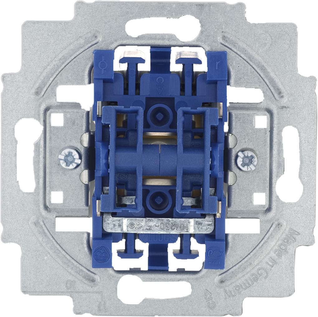 """Afbryder indsats med 2 fjedertryk for """"op og ned"""" (markise styring), konstrueret således at begge tryk ikke kan sluttes samtidigt"""