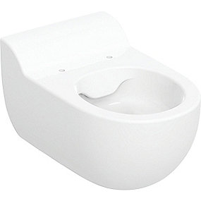 Geberit Bambini væghængt toilet til børn, Rimfree, til toiletsæde: T=53cm, Hvid. Væghængt. Rimfree. Frihøjde 7 cm. Skjulte monteringsbeslag. Højde overkant porcelæn: 35 cm. Til børn. Til børnepasningsordninger. Til indbygningscisterner