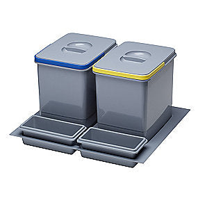 PRACTIKO600 affaldssystem, designet i to forskellige varianter, med praktisk opbevaringsbakke.Beregnet til montering i skuffeskab. Beholdere med aftagelige låg og farvede håndtag.