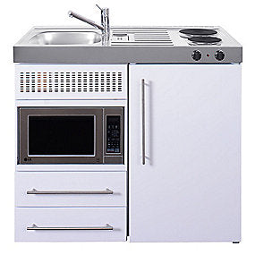 Minikøkken Trend Premiumline. Hvid med vask til venstre, køleskab, kogeplader, mikroovn og skufferTrend Premiumline Minikøkken fra Intra Juvel. Har du behov for et køkken hvor pladsen er trang som f.eks en lille lejlighed eller kolonihavehus, så er minikøkkenet fra Juvel ideelt. Leveres med underskab i hvidlakeret stålplade eller rustfri stål. Med skumisolering i lågerne.