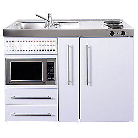 Minikøkken Trend Premiumline. Hvid med vask til venstre, køleskab, kogeplader, mikroovn og skufferTrend Premiumline Minikøkken fra Intra Juvel. Har du behov for et køkken hvor pladsen er trang som f.eks en lille lejlighed eller kolonihavehus, så er minikøkkenet fra Juvel ideelt. Leveres med underskab i hvidlakeret stålplade eller rustfri stål. Med skumisolering i lågerne.