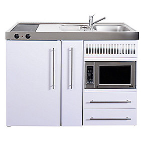 Minikøkken Trend Premiumline. Hvid med vask til højre, køleskab, keramiske kogeplader, mikroovn og skufferTrend Premiumline Minikøkken fra Intra Juvel. Har du behov for et køkken hvor pladsen er trang som f.eks en lille lejlighed eller kolonihavehus, så er minikøkkenet fra Juvel ideelt. Leveres med underskab i hvidlakeret stålplade eller rustfri stål. Med skumisolering i lågerne.
