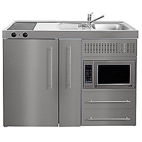 Minikøkken Trend Premiumline. Stål med vask til højre, køleskab, keramiske kogeplader, mikroovn og skuffer Trend Premiumline Minikøkken fra Intra Juvel. Har du behov for et køkken hvor pladsen er trang som f.eks en lille lejlighed eller kolonihavehus, så er minikøkkenet fra Juvel ideelt. Leveres med underskab i hvidlakeret stålplade eller rustfri stål. Med skumisolering i lågerne.