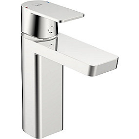 Håndvaskarmatur med fast tud. Vandhanen har en integreret perlator, hvis vinkel kan justeres for at forhindre vandstænk.