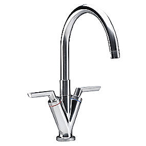 Damixa Venus Køkkenarmatur med høj C-tud. Svingtud med 120 grader begrænsning. Klassisk 2-grebs armatur med keramisk regulering. Reguleringsventil til varmt vand: 745124602Reguleringsventil til koldt vand: 745124601