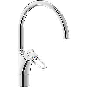FMM 9000XE køkkenarmatur, C-tud. Børstet krom. LEED-Tilpasset. Koldstart. G3/8. Soft Closing og keramisk kartusche med indbygget temperatur- og flowbegrænser. Fremspring: 235 mm. Eco-flow: 4,5 l/min. Blyfri. Lydklasse 1.