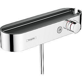 . 1 udtag. temperatur- og mængderegulering. Select-knap til at åbne/lukke for 1 udtag. håndbruserholder integreret i hylden. CoolContact termostat: Forhindrer, at armaturets overflade varmes op, og gør brusebadet endnu mere sikkert. maks. gennemstrømningsmængde ved 3 bar: 16,3 l/min . sikkerhedsspærre ved 40 °C. justerbar temperaturbegrænsning. med isoleret vandføring. kontraventil. med lyddæmper. hylde af kunststof. hyldeoverflade: grafit . grebsmateriale: kunststof . centerafstand: 150 ± 12 mm . tilslutningstype: S-tilslutninger, G ½ . smudsfilter medfølger
