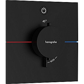 . 1 udtag. komfortabel at tænde/slukke med stor Select-betjeningsplade. præcis temperaturregulering takket være vertikal grebstruktur og følbar respons fra termostatgrebet. kontrol af vandgennemstrømning med stop-funktion. termostatkartusche, Start-/stop-ventil. maks. gennemstrømningsmængde ved 3 bar: 20,3 l/min . flad roset for mere plads i bruseren. roset kan justeres med +/- 3°. nem montering på grund af formonteret funktionsblok. greb altid i samme højde uanset indbygningsdelens installationsdybde. sikkerhedsspærre ved 40 °C. justerbar temperaturbegrænsning. termostaten har mulighed for termisk desinfektion. materiale på knap: metal . grebsmateriale: metal . tilslutningstype: indbygningsdel iBox universal 2 (# 01500180). Design-highlight: Ultra-fladt design giver dig mere plads - pin-grebet forbliver altid i samme højde. Termostatfunktion: fastholder automatisk den valgte temperatur og beskytter mod vand, der er for varmt eller koldt. Termostaten til indbygning styrer én funktion, f.eks. kartuden eller et brusehoved. Hurtigt og sikkert: Der åbnes og lukkes for vandet med et tryk på en knap (Select). Vandbesparende: Vandmængden kan reduceres individuelt, hvis det ønskes (water flow control). Fem års frivillig garanti på produktet, der lever op til de højeste kvalitetsstandarder. Fordele ved indbygget montering: Mere plads i badet. Indbygningsdel krævet til montering (#01500180). Praktisk lukkefunktion: Vandet kan også lukkes helt for nem rengøring af Select-knapperne. Mere sikkert: Meget varmt vand frigives først, når der er trykket på en knap på grebet (SafetyStop). Nem at bruge: Det ergonomiske pin-greb gør det hurtigt og nemt at indstille den ønskede temperatur. Perfekt pasform: Vægrosetten kan også efterfølgende justeres med +/- 3°.. Bedre hygiejne: giver mulighed for termisk desinfektion. Leveringsomfang: Funktionsblok, befæstelsesmateriale, termostatarmatur, monteringsvejledning. Fremstillet af materialer af høj kvalitet for større sikkerhed og bæredygtighed i hjemmet. hansgrohe, der blev grundlagt i 1901, er det førende mærke inden for pålidelige badeværelses- og køkkenprodukter