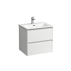 Laufen Palace møbelpakke 60cm med 2 skuffer med gennemgående, integreret, alugreb i toppen af skuffen.Skufferne er med softclose for den nemme, stille lukning og leveres med en vask i enkelt, tyndt design. Der er udskæring i den øverste skuffe, der giver plads til vandlåsen og en transparent indsats til diverse småting i skuffen.Møblet leveres i den populære mathvide overflade, i vores rengøringsvenlige, slidstærke folie med ABS hjørner for yderligere forstærkning.Møblet findes også i hvid højglans, lys elm, mørk elm og den karakteristiske Traffic Grey samt mange andre specialfarver.PALACE designserien, med de stramme linjer og det enkle, elegante udtryk, klæder det Nordiske badeværelse og giver brugeren bred mulighed for styling i den retning, der passer til ens unikke stil.