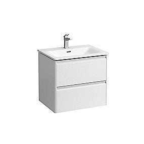 Laufen Palace møbelpakke 60cm med 2 skuffer med gennemgående, integreret, alugreb i toppen af skuffen.Skufferne er med softclose for den nemme, stille lukning og leveres med en vask i enkelt, tyndt design. Der er udskæring i den øverste skuffe, der giver plads til vandlåsen og en transparent indsats til diverse småting i skuffen.Møblet leveres i hvid Højglans overflade, i vores rengøringsvenlige, slidstærke folie med ABS hjørner for yderligere forstærkning.Møblet findes også i mathvid, lys elm, mørk elm og den karakteristiske Traffic Grey samt mange andre specialfarver.PALACE designserien, med de stramme linjer og det enkle, elegante udtryk, klæder det Nordiske badeværelse og giver brugeren bred mulighed for styling i den retning, der passer til ens unikke stil.