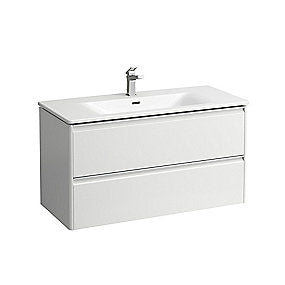 Laufen Palace møbelpakke 100cm med 2 skuffer med gennemgående, integreret, alugreb i toppen af skuffen.Skufferne er med softclose for den nemme, stille lukning og leveres med en vask i enkelt, tyndt design. Der er udskæring i den øverste skuffe, der giver plads til vandlåsen og en transparent indsats til diverse småting i skuffen.Møblet leveres i hvid Højglans overflade, i vores rengøringsvenlige, slidstærke folie med ABS hjørner for yderligere forstærkning.Møblet findes også i mathvid, lys elm, mørk elm og den karakteristiske Traffic Grey samt mange andre specialfarver.PALACE designserien, med de stramme linjer og det enkle, elegante udtryk, klæder det Nordiske badeværelse og giver brugeren bred mulighed for styling i den retning, der passer til ens unikke stil.