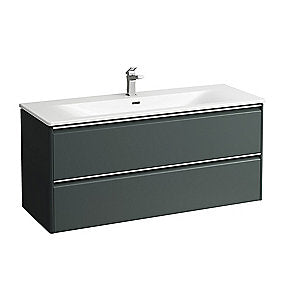 Laufen Palace møbelpakke 120cm med 2 skuffer med gennemgående, integreret, alugreb i toppen af skuffen.Skufferne er med softclose for den nemme, stille lukning og leveres med en vask i enkelt, tyndt design. Der er udskæring i den øverste skuffe, der giver plads til vandlåsen og en transparent indsats til diverse småting i skuffen.Møblet leveres i den karakterisktiske Traffic Grey overflade, i vores rengøringsvenlige, slidstærke folie med ABS hjørner for yderligere forstærkning.Møblet findes også i mathvid, hvid Højglans, lys elm og mørk elm samt mange andre specialfarver.PALACE designserien, med de stramme linjer og det enkle, elegante udtryk, klæder det Nordiske badeværelse og giver brugeren bred mulighed for styling i den retning, der passer til ens unikke stil.