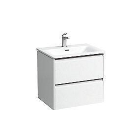 Laufen Palace møbelpakke 60cm med 2 skuffer med gennemgående, integreret, sort alugreb i toppen af skuffen.Skufferne er med softclose for den nemme, stille lukning og leveres med en vask i enkelt, tyndt design. Der er udskæring i den øverste skuffe, der giver plads til vandlåsen og en transparent indsats til diverse småting i skuffen.Møblet leveres i den populære mathvide overflade, i vores rengøringsvenlige, slidstærke folie med ABS hjørner for yderligere forstærkning.Møblet findes også i hvid højglans, lys elm, mørk elm og den karakteristiske Traffic Grey samt mange andre specialfarver.PALACE designserien, med de stramme linjer og det enkle, elegante udtryk, klæder det Nordiske badeværelse og giver brugeren bred mulighed for styling i den retning, der passer til ens unikke stil.