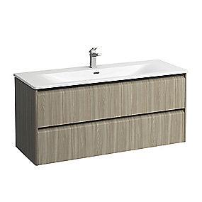 Laufen Palace møbelpakke 120cm med 2 skuffer med gennemgående, integreret, sort alugreb i toppen af skuffen.Skufferne er med softclose for den nemme, stille lukning og leveres med en vask i enkelt, tyndt design. Der er udskæring i den øverste skuffe, der giver plads til vandlåsen og en transparent indsats til diverse småting i skuffen.Møblet leveres i lys elm overflade, i vores rengøringsvenlige, slidstærke folie med ABS hjørner for yderligere forstærkning.Møblet findes også i mathvid, hvid Højglans, mørk elm og den karakteristiske Traffic Grey samt mange andre specialfarver.PALACE designserien, med de stramme linjer og det enkle, elegante udtryk, klæder det Nordiske badeværelse og giver brugeren bred mulighed for styling i den retning, der passer til ens unikke stil.
