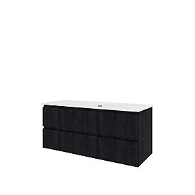 Sanibell Proline møbelsæt 121x46,8cm kul eg med lodrette lameller, bestående af skab med 2 grebsfrie softclose skuffer samt porcelænsvask uden hanehul. Varen leveres i 2 kolli: vask 0300150 & møbel 1228591