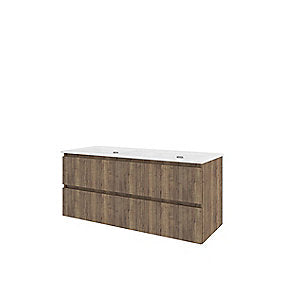 Sanibell Proline møbelsæt 121x46,8cm terra eg med lodrette lameller, bestående af skab med 2 grebsfrie softclose skuffer samt dobbeltporcelænsvask uden hanehul. Varen leveres i 2 kolli: vask 0300148 & møbel 1228582
