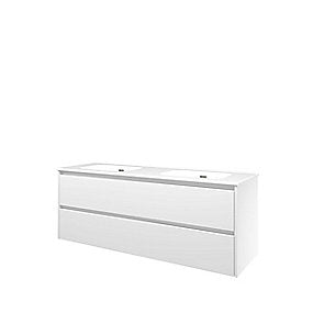 Sanibell Proline møbelsæt 141x46,8cm lakeret mathvid, bestående af skab med 2 grebsfrie softclose skuffer samt dobbelt porcelænsvask uden hanehul. Varen leveres i 2 kolli: vask 0300151 & møbel 1228152
