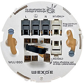 Lampeudtag til montering af lamper nedhængt i udtag med maksimal vægt på 5kg eller som tilslutningssted for lamper i ophæng. Lampeudtaget er forsynet med klemmer for montering af: Fase Nul Jord M1/DALI+ samt M2/DALI- .Beregnet for forfra loftmontage i godkendte Kaiser dåser benævnt herunder eller Schneider Electric PL-loftdåse.Montering i Kaiser dåse model 9263-22, 9264-22 (Ø68mm) eller HWD30 (Ø74mm), der er godkendt til loftmontageDer bores i loftet med en Kaiser 1083-10 (Ø68mm) 1084-10 (Ø74mm) hulsav eller tilsvarende, hvor man ønsker lampeudtaget. Installationskablerne indføres i dåsen via huller der modsvarer diameteren på det brugte kabel. Det er muligt at sløjfe op til fire kabler i lampeudtagets klemmer for Fase, Nul og Jord, samt to kabler i M1/DALI+ samt M2/DALI-.De enkelte ledere afisoleres 10mm og indføres i klemmerne. Skal man demontere en leder, drejes skiftevis mod højre og venstre, samtidig med, at der trækkes i lederen. Lampeudtaget skubbes op over skruerne i dåsen, og drejes mod uret til skruerne er i bund, og skruerne spændes efterfølgende til. tiv montering PL-loftdåseMontagen for installation af PL-loftdåse og ovenstående montagevejledning af lampeudtag følges, dog drejes lampeudtag fast i dåse, ved at dreje med uret, og bruge skruehuller beregnet til PL-dåse. Montering af lampeledningLampeledningen afisoleres ca. 50 mm og indføres under trækaflastningen, der trykkes op, indtil ledningen er fastholdt. En skruetrækker indføres mellem klemmetop mærket press og udfræsning i udtag. Derved åbnes for ledningsindføring og ledningen føres ind, hvorefter skruetrækkeren trækkes tilbage igen, og tilslutningen er færdig.Dækslet trykkes op mod udtaget, og drejes nu en 1/8 omgang med uret, og installationen og tilslutningen afsluttet.Bemærk her, at den tilsluttede lampe ikke må belaste ledningen med større vægt, end ledningen kan bære. Hvis der er tale om en tungere lampe - maksimal 5kg - kan der skrues en 3mm krog op i centrum af udtaget for aflastning via kæde eller wire.I så fald udgår dækslet, og der skal afsluttes med en baldakin.Demontering i omvendt rækkefølge, og lampeledningen løsnes ved at dreje aflasteren i pilens retning hvorefter ledningen er fri igen.NB om bæreevne på dåsenBekendtgørelsen beskriver at dåsen skal kunne bære fem gange lampeudtagetsmaksimale belastning på 5kg, så godkendte dåser kan modstå belastning på 25kg.Monteres i materiale som Troldtekt, vil dette ikke kunne opretholdes med forfra montering, og man skal opbygge, så bæreevne opfyldes, eventuelt med Wexøe bærejern for 926x-22Dette må ikke forveksles med at et lampeudtag kan bære 25kg, her gælder de maksimalt 5kg til enhver tid. Tekniske data:Tæthedsklasse: IP20Max strøm: 16AMax spænding: 400VMål: Dåse for lampeudtag: 68mm 926x-22 eller 74mm HWD30 eller tiv PL-loftdåseDæksel: 82x12,5mmLedningshul: 7,5mm kan bores op til 13,5mmFarve: Ral 9010