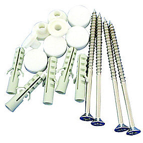 - Komplet sæt med 4 skruer, rawplugs, nylonbøsninger og hvide dækkapper