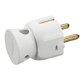 Schuko Vinkelstikprop M/J Hvid fra VVS Hjørnet sikrer pålidelig strømforsyning med vinklet design for trange rum, 16A 250V kapacitet, robust materiale og sikker jordforbindelse, ideel til professionelle og private el-installationer.