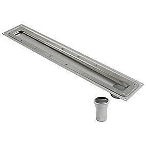 BADERUMSRENDE WATERLINE 1000.Gulv: vinyl.Ramme: rektangulær.Udløb: Ø50 mm, lodret.Rustfrit stål: AISI304/EN1.4301Til fri installation