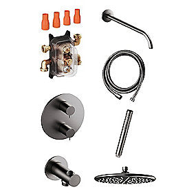 Silhouet Indbygningspakke indeholdende: Indbygningstermostat indvendige dele, udvendige dele (767065500), lang brusearm, vinkel m/bruserholder, Silhouet hovedbruser, Tube håndbruser og 1500 mm metal bruserslange. Brushed Graphite Grey (PVD) overflade. Den særlige PVD-belægning giver en hårdere og endnu mere robust overflade, som er ekstremt modstandsdygtig overfor ridser, korrosion og misfarvning.