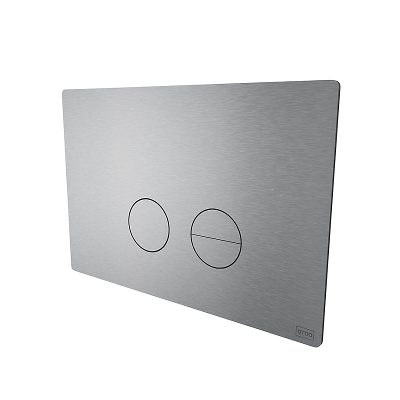 Eksklusiv badeværelsespakke i børstet stål med armaturer fra QTOO d line og væghængt toilet fra Laufen. Elegant design og materialer i højeste kvalitet.