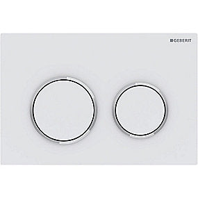 Geberit Omega20 betjeningsplade til dobbeltskyl: hvid matlakeret, easy-to-clean-belagt, blankforkromet. Top/front betjening. Trykstænger lydisoleret, hurtigindstilling uden værktøj. Til skyllestyring på Omega indbygningscisterner